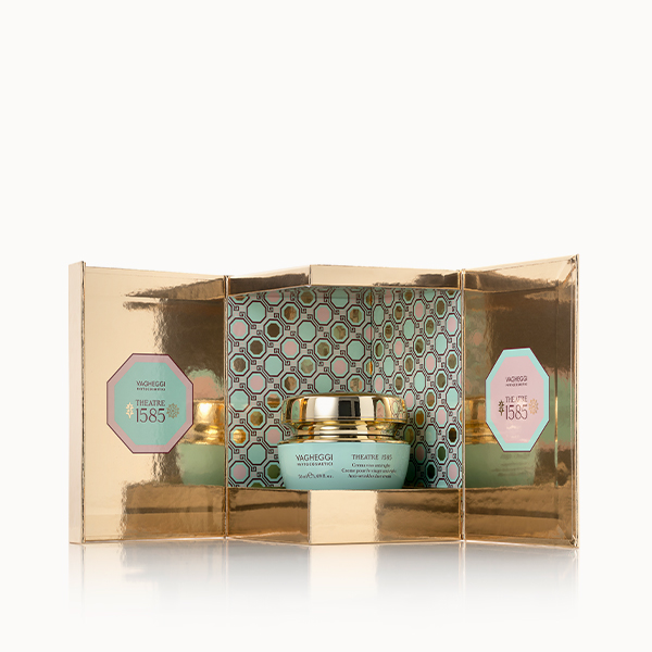 La Crema Viso Antirughe Theatre 1585 è la protagonista assoluta della nuova Christmas Limited Edition Vagheggi 2025. Ispirata alla maestosità del Teatro Olimpico di Vicenza, questa crema regala alla pelle una nuova armonia, come un abile regista che riscrive i contorni del viso.